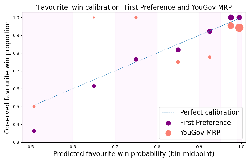 Comparing calibration against the final YouGov MRP poll model in the figure above highlights the reasonably healthy behaviour of the First Preference model. The dashed blue line represents perfect calibration. Observations above the line are underconfident - giving the favourite a smaller-than-observed probability of winning; those below the line are overconfident. The YouGov model suffered from systematic overconfidence: most of its predictions were very confident, however from the 70 electorates where the favourite rounded up to a 100% chance of winning, 4 of them lost! While fewer of YouGov's favourites lost (14 compared to 22), the First Preference model's probabilities proved to be substantially more trustworthy based on this calibration analysis.
